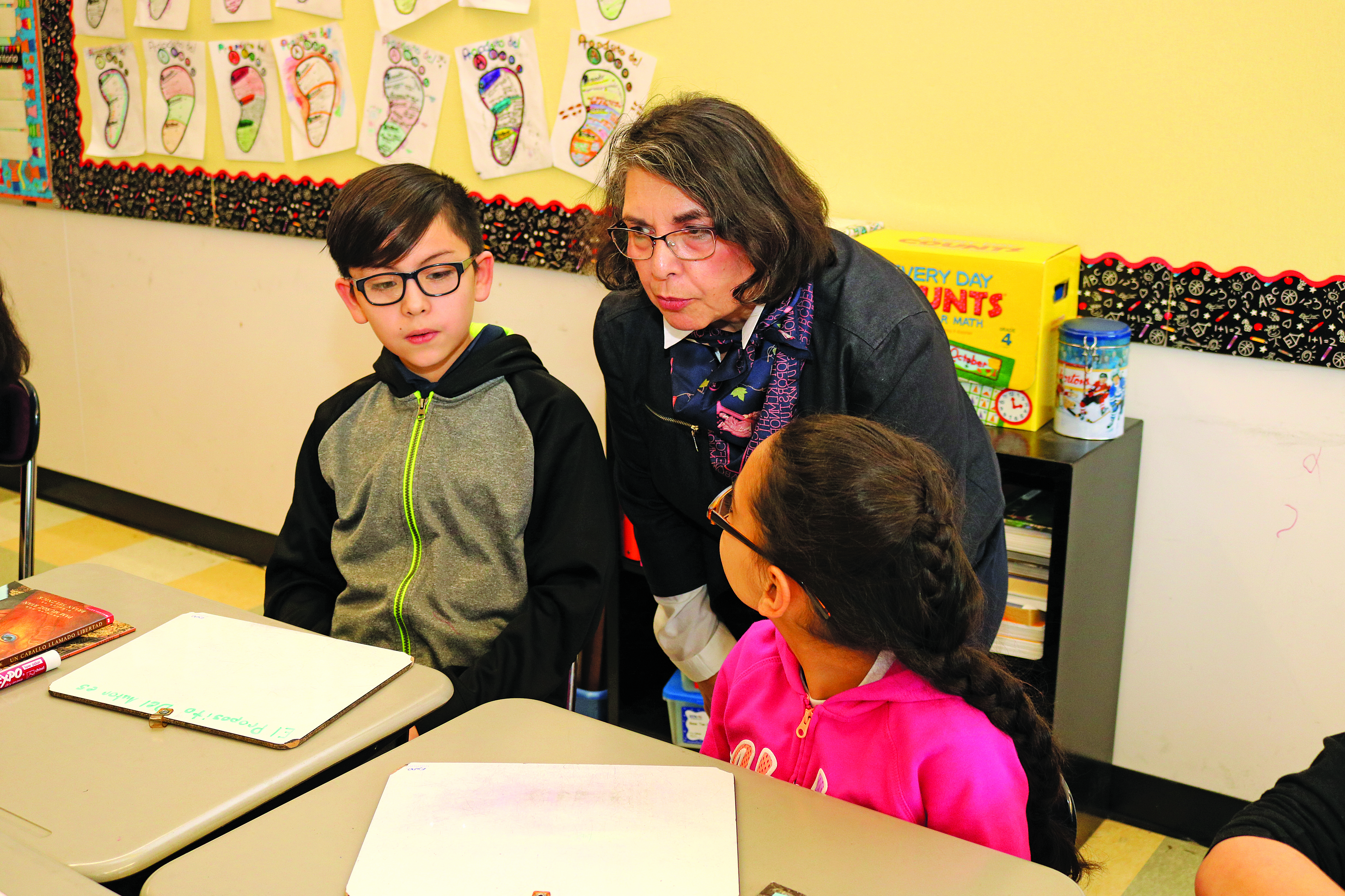 Brockton bilingual education K-8 department head Vula Roumis talks to Anthony Xique-Najera and Aileen Dominquez, fourth-graders in the program.